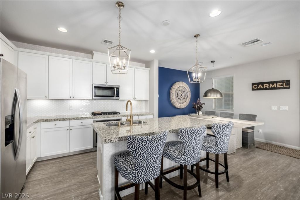 Beautifully upgraded, like-new home in the highly sought-after Paseos! Just one year old, this exceptional residence shows like a model, featuring modern finishes and upgrades throughout. Situated on a premium corner lot, the home offers 3 spacious bedrooms, 2.5 baths, and an open-concept floorplan designed for comfortable living and entertaining. The stylish kitchen is equipped with high-end appliances, sleek cabinetry, and ample counter space, flowing seamlessly into the main living areas. Step outside to the true showstopper?a stunning rooftop deck with breathtaking, panoramic views of Red Rock Canyon and the Las Vegas Strip, perfect for relaxing or entertaining. Residents enjoy access to a beautiful community pool, nearby Fox Hill Park, and the highly coveted Vassiliadis Elementary, Rogich Middle and Palo Verde High Schools. Combining location, lifestyle, and luxury, this home truly has it all!
